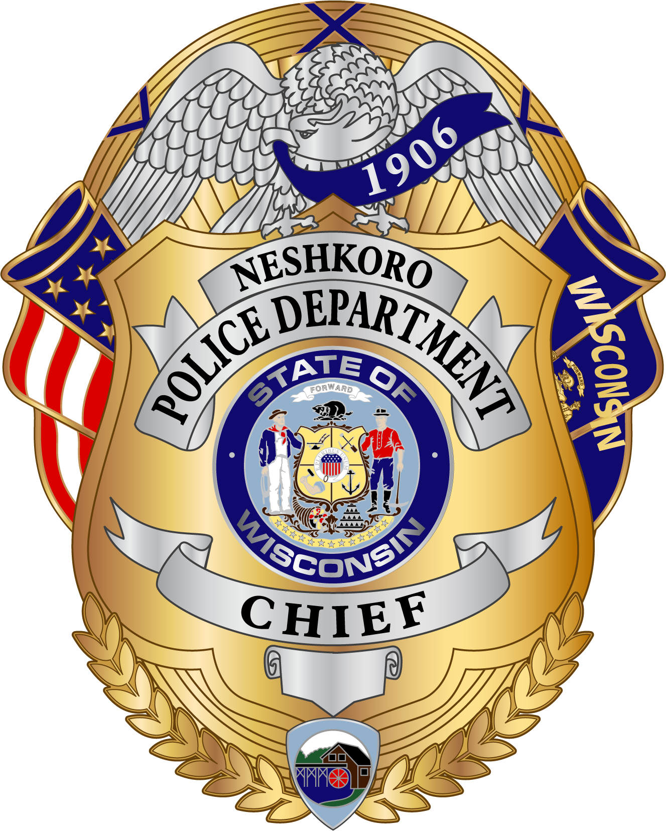 Village of Neshkoro Police Chief Brendan Cutrell’s new police patch was inspired by our rich history: