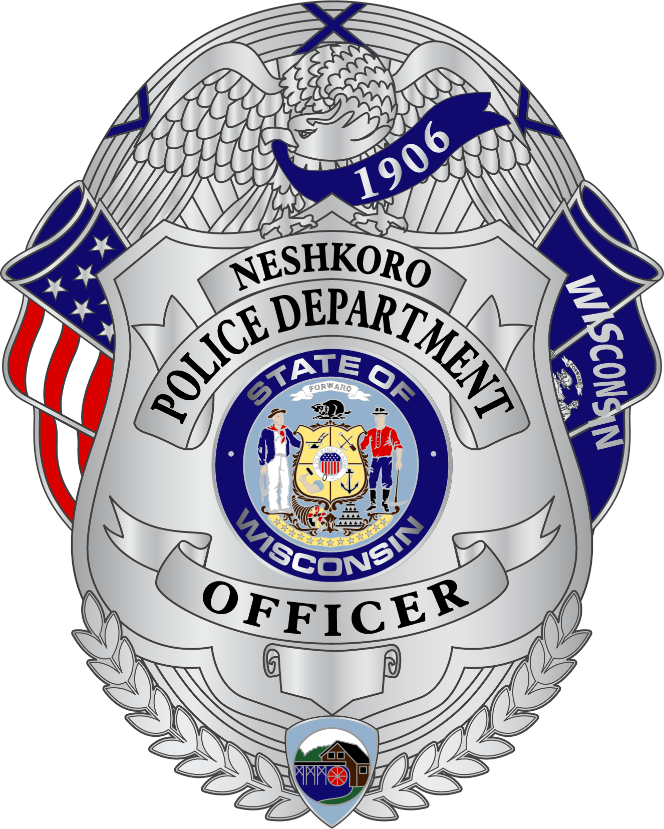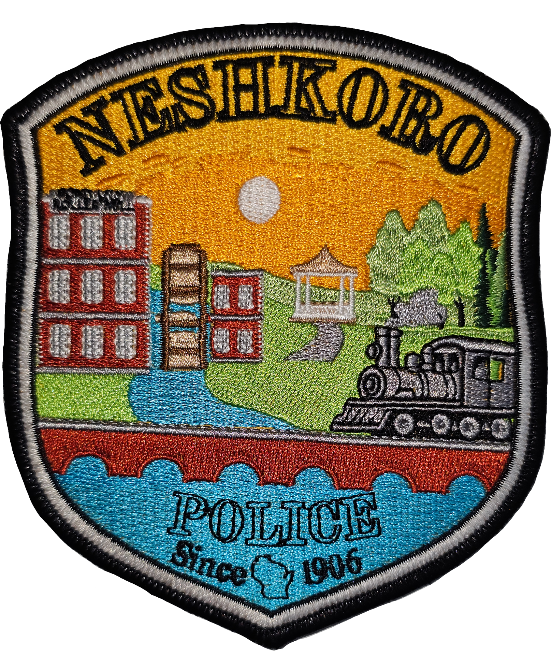 “In collaboration with the history of the Village, a new police department patch design has been adopted. In the foreground is the well known Neshkoro Millpond, used for its many recreational activities. Following the water ‘upstream’ to the dam and bridge, which has a locomotive crossing it. Neshkoro saw its first train on the Chicago & North Western Rail come into town in 1905. The railway provided many business opportunities for the surrounding businesses and community members. Incorporated into the background is the Lily Pond Roller Mill, and its distinguished ‘water wheel’. Paying tribute to the Village’s history of its parks and love for the outdoors, is a sidewalk leading to the white Gazebo, where one could enjoy the beautiful sunset, as depicted.”